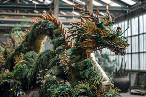 the great dragon of earth and nature, body made of copper, plants and flowers, bloated with green energy, strong and massive, majestuous --ar 3:2 --style raw --v 6.0