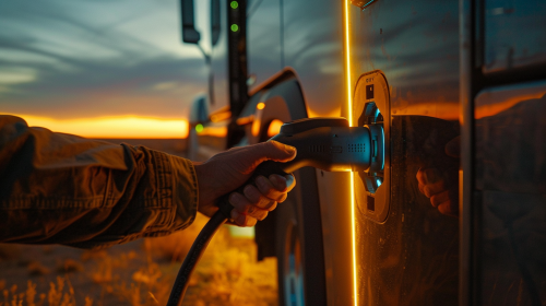 close up of a hand plugging in a EV charging cable to an eCascadia freightliner truck sony a7r desert sunset --ar 16:9 --v 6.0