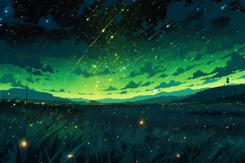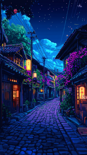 Pixel art. A vibrant anime landscape. Nighttime. Studio Ghibli-inspired. Vivid colours. Intricate detailing. Soft light and shadow play. No people in the scene. 4K quality --ar 9:16