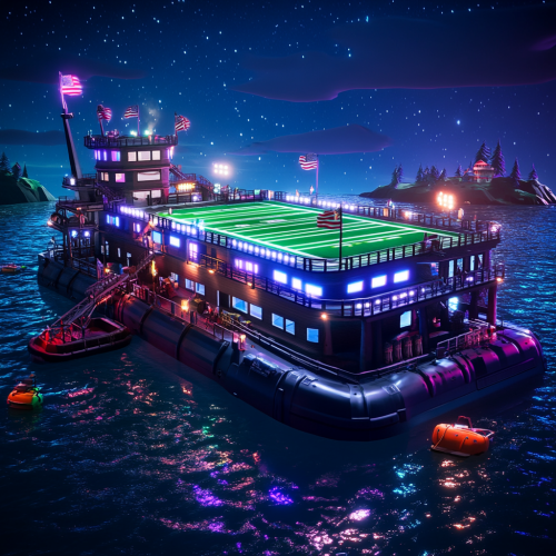barge with american football field, bright lights, night,stars, muddy Mississippi River, docked in in Casino River bost marina,rendered in style of fortnite