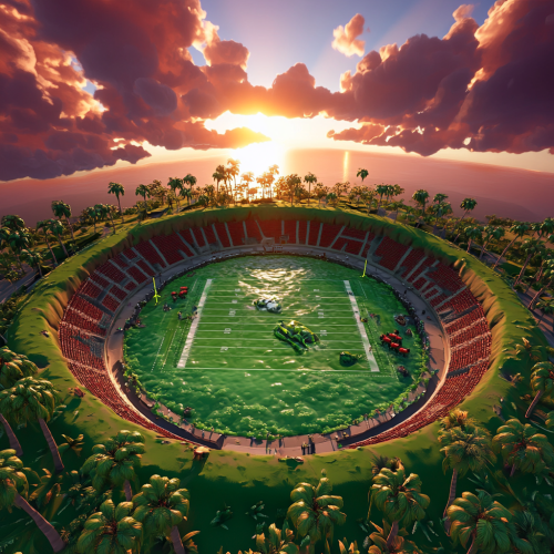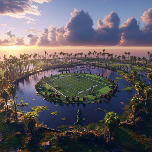 massive round football field/ roller derby, outer edge of field is higher than the inside edge, sunken lime green swamp in center of field, Everglades, palm trees, oak trees with spanish moss, sunset, green swamp monsters wearing red american football jerseys on field, large storm clouds in distance, rendered in style of fortnite