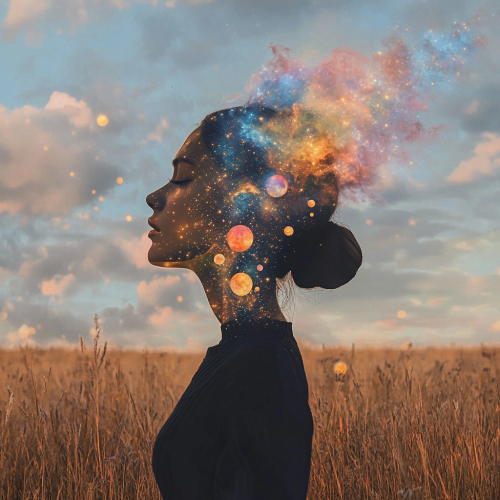 a woman standing in a field in profile her head turned towards the sky and from her chest emanates shining stars and pretty coloured smoke like a galaxy with planets and stars. Colours gold pink, blue realistic