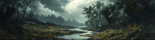 dnd ravenloft barovia renaissance gothic landscape, small stream flowing through a wooded area, grey clouds overhead, renaissance oil painting style --ar 96:25