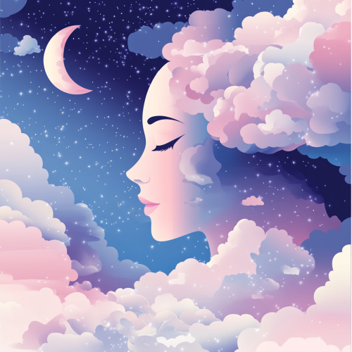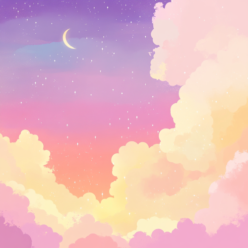 Create a spiritual design using soft pastel colors like pink, purple, and yellow in a gradient. Include elements such as clouds, a starry sky, and a small moon. Leave space in the center for text.