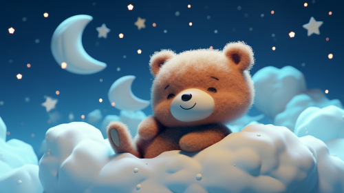 A cute teddy bear sleeping on clouds with the moon and stars in the sky, in the style of a cartoon, high resolution, colorful animation stills, animated GIFs, children's book illustrations, colorful. --ar 16:9 --v 5.2
