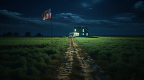 a green field landscape during night time. With only one house on one side of the field with an America flag on it. Cinematic, symmetrical --ar 16:9