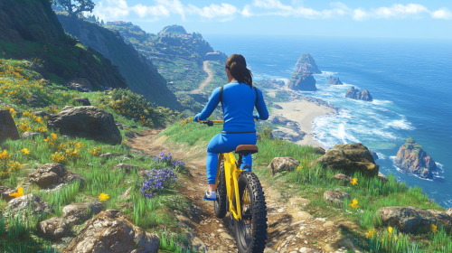 A high-quality, 3D game-like scene exclusively from a rear-view perspective of a girl in a blue sports tracksuit riding a bright yellow mountain bike uphill on a rocky, off-road trail along a cliffside surrounded by the ocean. The camera closely follows behind her, showing the back of her head, shoulders, and the bike as she navigates the rugged terrain. The path is surrounded by vibrant green grass, a few scattered rocks, and panoramic ocean views under a clear sky. The image captures the thrill of off-road biking with realistic lighting, detailed textures, and a clear rear view only, --ar 16:9