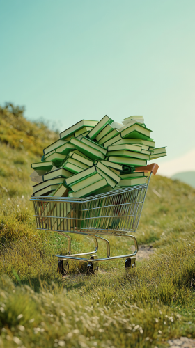 medium shot, shot on fujifilm, a shopping cart full of green books racing down a hill, books spilling out of the shopping cart, dynamic, sunny, warm, funny --ar 9:16