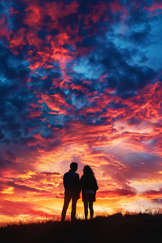 realistic, Two gorgeous lovers, see their face , stand at the edge of a hill overlooking a beautiful sunset. The sky is ablaze with vibrant oranges, reds, and purples. They’ve just had a difficult conversation about the future of their relationship. --v 6.0 --ar 2:3