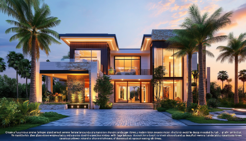 "Create a luxurious and serene landscape featuring a grand, elegant mansion surrounded by tall, swaying palm trees. The mansion should be designed in a modern architectural style with large glass windows, a spacious balcony, and a beautifully landscaped garden in front. The scene should evoke a sense of exclusivity and opulence, with the house positioned on a slight hill overlooking a scenic view. The palm trees should be tall and graceful, framing the mansion and adding a tropical, relaxing vibe to the setting. The sky should be clear with a warm, golden sunset casting soft, glowing light across the scene, creating an inviting and tranquil atmosphere. Include subtle details like a cobblestone driveway leading up to the mansion, a sparkling water feature or fountain in the front yard, and lush greenery that enhances the luxurious feel of the environment. The overall composition should blend natural beauty with sophisticated elegance, capturing the essence of a dream home in a tropical paradise." --ar 7:4