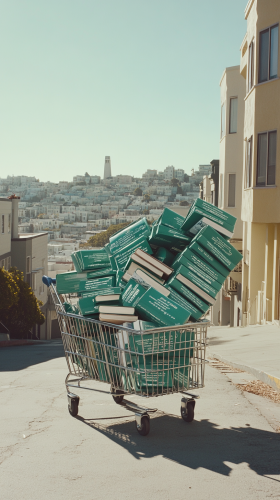 medium shot, shot on fujifilm, a shopping cart full of green books falling down a hill, books spilling out of the shopping cart, san francisco, dynamic, sunny, warm, funny --ar 9:16