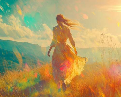 A beautiful pail woman is running down a grassy hill, it's sunny after heavy rain and a bright sun casts wild shadows, the wind is blowing in her long hair , behind her is the horizon, dramatic nature, emotional art, bright colors, negative colors, shapes are fluid and undefined, high definition digital art, negative color, a mix of pastel colors and neon, a poetic and creative perspective, inspired by Man Ray's visionary photography, large-screen camera, photo art that is also inspired by digital art, cold color scale with hints of flickering neon, --ar 5:4 --p 6s1y8tz