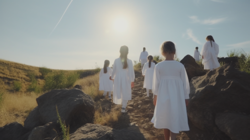shot from behind of children girls and boys in white clothing carrying rocks up a hill, renaissance aesthetic, wide angle, hyper realistic, 4k --ar 16:9 --v 5.0