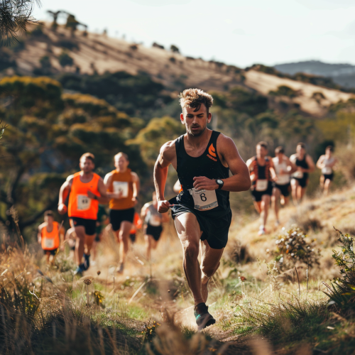 a fitness competitor running up a hill with other competitors behind him all wearing waited vests