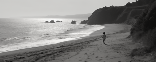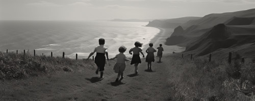 lateral view of kids in 1945 running up a hill from left to right, a beach with calm sea on the left, black and white, noir film, 16K, Sharp focus, --q 0.5 --ar 5:2