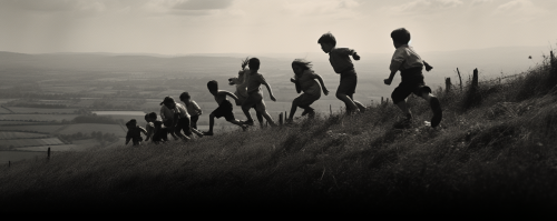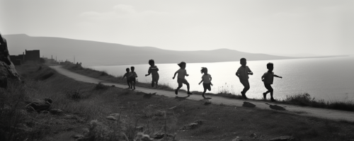 lateral view of kids in 1945 running up a high hill from left to right, black and white, noir film, 16K, Sharp focus, --q 0.5 --ar 5:2
