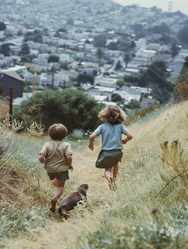 two kids running up a San Francisco hill, chasing an otter, kodakchrome landcape photograph, realistic, natural, photorealistic/ --ar 3:4 --v 6.0