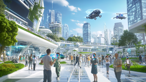Hyper realistic photograph for news media of a futuristic city designed for enhanced communication, people interacting through holographic displays and wearable technology, sleek skyscrapers with digital facades, seamless public spaces encouraging human connection, flying vehicles gliding above transparent walkways, smart city infrastructure integrating AI and real-time data sharing, lush greenery coexisting with advanced urban designs, diverse groups of people communicating effortlessly across languages, futuristic plazas filled with social energy, peaceful yet vibrant atmosphere, dynamic exchanges in a high-tech environment, Captivating photo, these photographs taken with an SLR or mirrorless camera, --ar 16:9 --style raw --stylize 50 --no words text watermarks signatures captions subtitles scrolling-tickers logo-mark logo-text description commentary title-statement title-wording