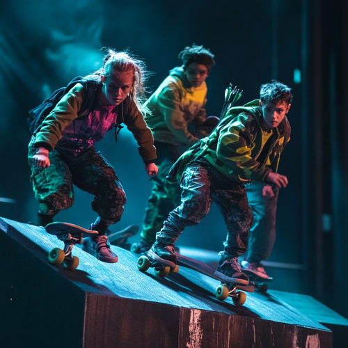 5 characters for a dystopian, futuristic and adventurous theatrical production of Robin Hood where everyone are kids and youths, in the style of The Rest of Us, some are on skateboards, one on bmx, with bow and arrows, atmosphere is brave and hopeful.