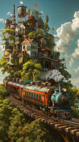 Train functioning as city, solar punk --ar 9:16 --v 6.0