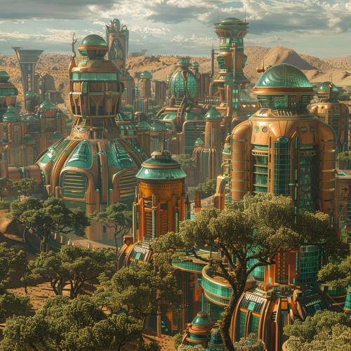 futuristic city in the desert seen from a hill with taller buildings towards the center of town built using mostly copper with turquoise trim and glass windows lightly tinted green with lots of trees in teh streets