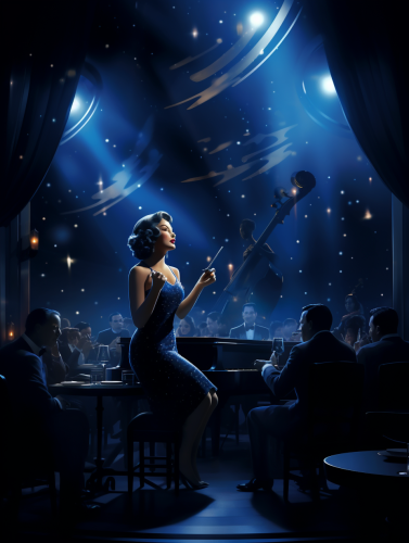 1940 jazz club, blue lighting, singer on stage in front of large band, twinkling lights, fog, small tables, stars and moon decoration, --ar 3:4