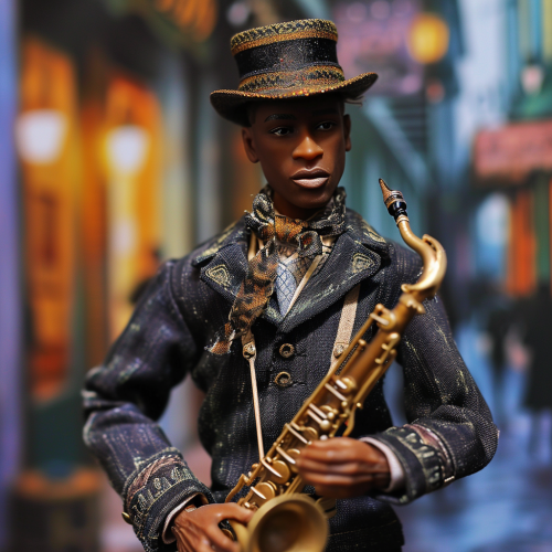 Ken doll, African American, dressed like a jazz musician in 1920 New Orleans, hyper realistic, --style raw --v 6.0