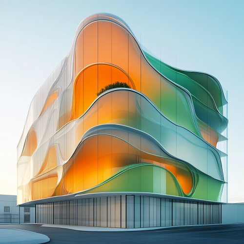 Design a facade for a modern rectangular building, inspired by flowing, organic shapes. The facade should feature smooth, undulating forms with soft curves and layers, crafted from light materials like translucent panels or white concrete. Integrate a vibrant color transition that shifts from a warm orange at the base to a soft green toward the top, creating an 'energy flowing' effect as seen in the reference images. Use vertical sculptural elements to add texture and depth, with dynamic lighting that emphasizes the color gradient. Add touches of greenery on some balconies for a natural accent, and create an aesthetic that feels futuristic, serene, and seamlessly integrated into the urban environment. --q 0.5