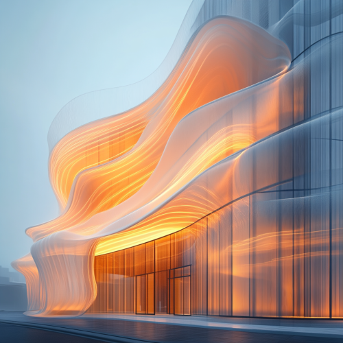 Create a building facade with a soft, flowing design that resembles fabric draping over the structure. The facade should feature smooth, organic curves and translucent or semi-transparent materials, with a gradient of warm orange lighting emanating from within. The design should give an impression of energy and movement, creating a dynamic, almost ethereal effect as the light filters through the wavy layers. The aesthetic should feel modern and artistic, blending architecture and light to evoke a sense of fluidity and elegance. --q 0.5