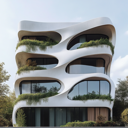 Create a modern facade design for a rectangular building. The facade should have a sculptural, flowing design inspired by organic shapes and curves. Use smooth, white concrete or light materials that create undulating, wave-like balconies and vertical elements with openings that filter light. Incorporate greenery on select balcony levels, creating a harmonious blend with nature. The overall style should feel futuristic yet minimal, with a focus on rhythm, shadow play, and soft edges. The building should evoke a sense of elegance and fluidity, with architectural details that feel both structural and ornamental. --q 0.5