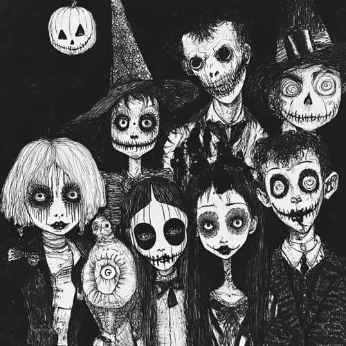 Create an eerie group portrait of characters, each with unique yet unsettling makeup and costumes, evoking the spirit of a peculiar Halloween gathering. Apply intricate cross-hatching to define the shadows and subtle textures in their costumes and facial expressions. The figures should be drawn with slightly exaggerated, caricature-like proportions, their features both playful and melancholic, staying true to Gorey’s iconic character style. Position the characters in a loosely organized manner, as though frozen mid-celebration, with a sense of stillness that contrasts with their festive attire. The background should be minimal, fading into darkness, leaving only a suggestion of a storefront or vague urban setting with dim lights, enhancing the atmospheric tension. Integrate symbolic elements such as ghostly silhouettes, pumpkins, or whimsical masks floating subtly in the scene, hinting at a narrative left to the viewer's imagination. The overall mood should blend a playful Halloween charm with an undertone of quiet unease.