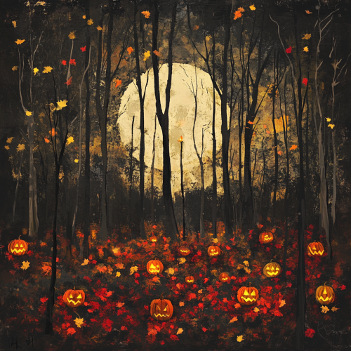 a dark fall halloween night with the silouhette of a forest in the background under a full moon. candles and leaves everywhere among the many yellow, orange, and red leaves scattered everywhere and on the trees as well as lit, evil looking jack o lanterns