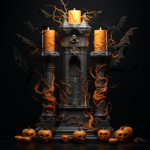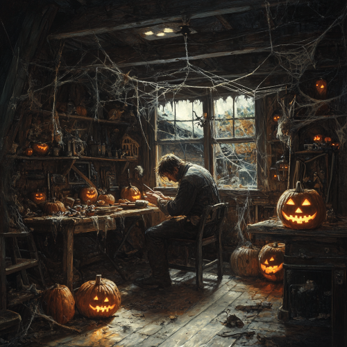 A spooky carpenter in a dimly lit workshop, carving intricate Halloween decorations from wood. Cobwebs hang from the rafters, and jack-o'-lanterns flicker in the corners, casting eerie shadows