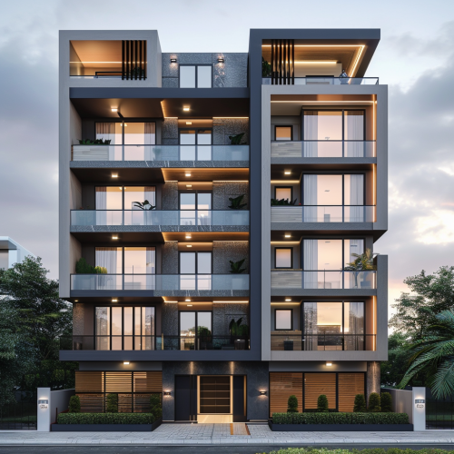 architectural facade design for G+15 FLOOR inspired from modern building and farme work on it with balconies in front .color palette grey white beige blackj.louver in facade