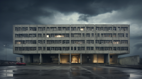 a brutalist 3 storey building latinamerican frontal facade made of concrete of a poor school full of broken windows in a cloudy day, photorealistic, very iluminated, neutral white balance --ar 16:9