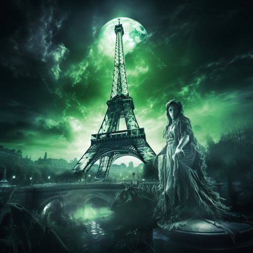 Transform a famous landmark into a spooky Halloween spectacle! Envision the Eiffel Tower draped in ghostly white fabric, with eerie green lights casting haunting shadows. Create an image that blends Parisian elegance with Halloween chills. [Halloween at famous place, Eiffel Tower, Spooky spectacle, Green lights, Parisian elegance]