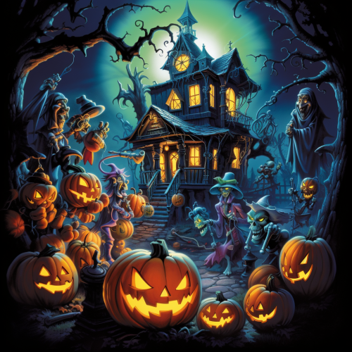 An art poster featuring an image of ghosts and ghouls Halloween, decorations up in a hunted house a start ps1 graphics, jason edmiston, youthful protagonists, carl barks, transportcore, whirly Halloween theme