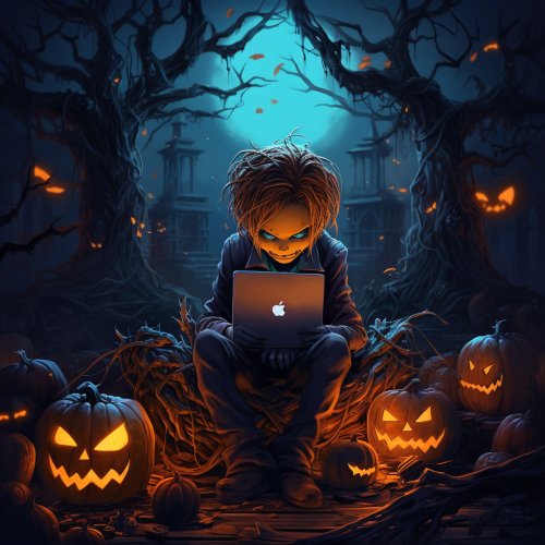 **helloween thematic, the most horrible helloween story in the world is that you boss try to whatsapp you at 11pm, with background image at office, illustrator, less content and colour details im the image