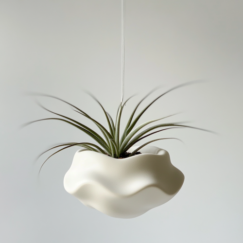 a photo of a matt white porcelain ornamental plant pot. The plant pot is small, playful and tasteful. The plant pot is for air plants. The plant pot is hanging in front of a white background.