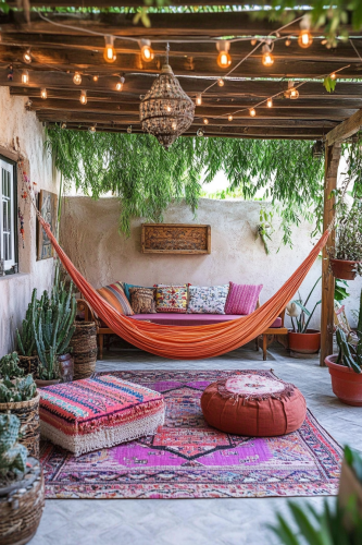 Design a bohemian chic patio with eclectic, colorful furniture, including low seating, ottomans, and a hammock. The area is filled with a mix of patterned textiles, hanging plants, and vintage finds that create a relaxed, artistic vibe. An outdoor rug with ethnic patterns covers the floor, and string lights add a warm, whimsical glow. This space should feel like a creative retreat, inviting users to unwind and express their free spirit. Neat and organized. Camera: DSLR - Canon EOS 5D Mark IV. Lens: Canon EF 24-70mm f/2.8L II USM. Composition: Wide shot, room-centered, horizontal orientation, balance between furniture and space. Film: Digital, high resolution, color profile sRGB. Camera settings: ISO 400, f/2.8, 1/60 sec. --ar 2:3 --v 6.1 --s 250