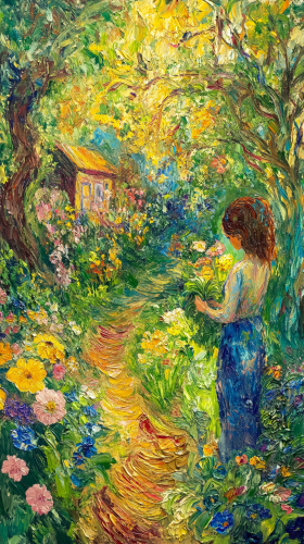 A woman tending to a garden, planting flowers with a soft, content expression Mood: Peace, connection to nature, lasting beauty Style: Vincent Van Gogh, Perspective: close-up, early afternoon, Colors: Bright yellows, rich greens, pinks, and blues for the flowers, Background: a lush garden, swirls of leaves and petals, with a sun-dappled path leading to a small house. --ar 9:16