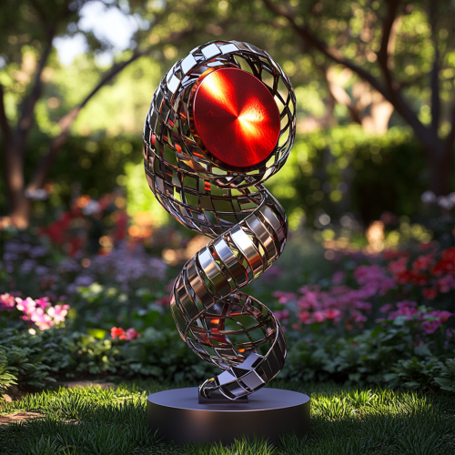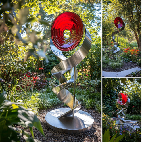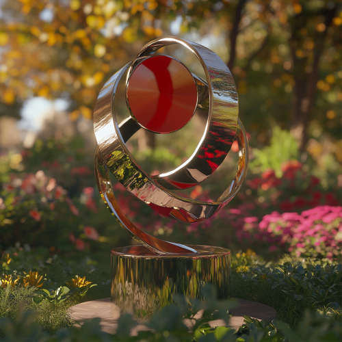 kinetic metal sculpture with a 100 cm high pedestal, composed of a few stainless steel elements and a red rotating disc, background a beautiful garden of flowers and lush plants, beautiful sunny day, 4 frames with views from different angles ultra detailed, soft lighting, beautifully color graded, Unreal Engine, Cinematic , Color Grading, Photoshoot, Shot on 85mm lens, f1.2, Depth of Field, DOF, 32k, Super-Resolution, Megapixel, Backlight, Natural Lighting, Soft Lighting, Conte-Jour, Beautiful Lighting, Global Illumination, hyper maximalist , elegant, dynamic pose, photorealistic, 8K, volumetric lighting , high contrast , HDR , --style raw --v 6.1