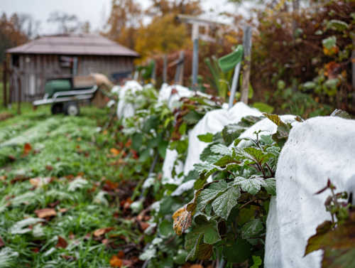 Close-up of Plants Covered with White Winter Fleece Fabric in a Garden: The image shows a well-maintained garden in a typical Polish backyard during late autumn. In the foreground, there is a close-up of bushy green plants securely covered with white agrowłóknina (fleece fabric), which is carefully wrapped around the plants and pinned down with metal stakes. In the background, you can see a small wooden shed, a wheelbarrow filled with gardening tools, and a few fallen leaves scattered around the grassy area, emphasizing the season and the need for plant protection --ar 4:3 --s 50 --v 6.0