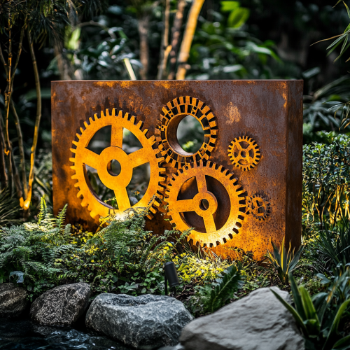 Metal garden sculpture in steampunk style, minimalist design, intricate gears and cogs subtly integrated, sleek and streamlined look, rusted and brushed metal finish, atmospheric lighting casting shadows, detailed textures, HD, realistic, surrounded by natural garden elements like stones and plants, emphasizing simplicity and elegance, garden ornamentation, high-definition photograph, evening ligh