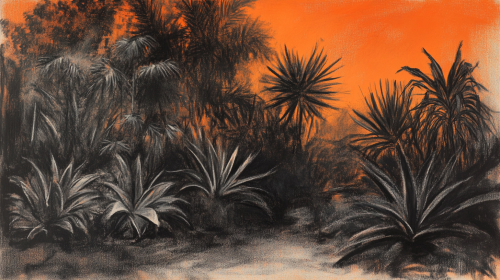 a charcoal sketch of a beautiful garden scene, with the aloe plants and their flowers highlighted in burned orange or sunset red white background --ar 16:9