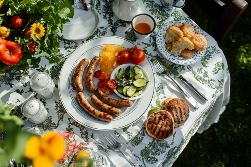 breakfast, set table, plate with sausagees, summer garden, view from above, breakfast on the table - pastries, vegetables, sausages, photography 8k --ar 3:2 --q 2 --v 6.1 --s 50