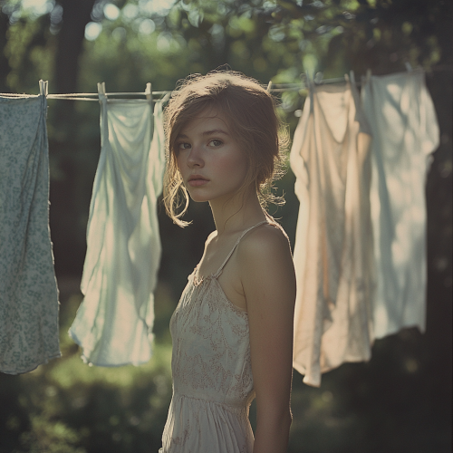The image depicts a young woman standing between lines of freshly washed laundry hanging outside to dry. She is captured in a soft, natural light that creates a warm and slightly nostalgic atmosphere. The woman is wearing a sleeveless, light-colored dress with a subtle, delicate pattern, which complements the vintage, timeless feel of the scene. She is turned slightly to the side, glancing over her shoulder with a serene and thoughtful expression. The sunlight filters through the fabric of the clothes, casting gentle shadows and highlighting the soft textures of the garments. The hanging clothes include light-colored items, possibly linens or summer dresses, fluttering gently in the breeze. The background is filled with leafy trees, indicating that this scene takes place in a peaceful, outdoor garden or backyard. The overall mood of the image is tranquil and reminiscent of a simpler, quieter time, where everyday tasks like hanging laundry become moments of quiet reflection. The composition and lighting enhance the intimate and serene quality of the scene.