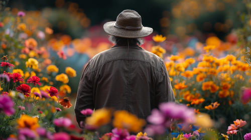 A gardener of around 55 years old, from behind, with his hat, working in the middle of a magnificent French garden with vibrant colors, very flowery, with beautiful summer light, hyper realistic, 4H --ar 16:9 --s 750 --v 6.0