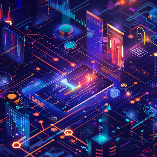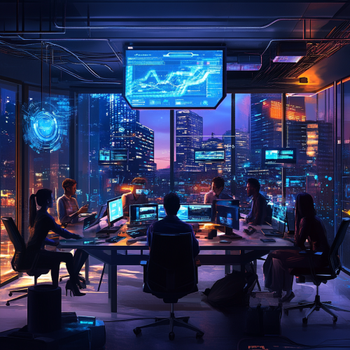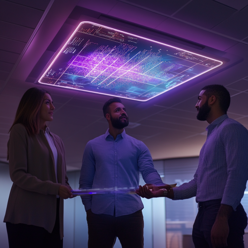A low-angle medium shot of a diverse team of professionals interacting around a digital holographic interface in a modern office space, with interactive graphics projected mid-air showcasing data analytics and cloud systems, illuminated by soft ambient light from sleek ceiling fixtures, captured with a Canon EOS-1D X Mark III, 50mm f/1.4 lens, cool tones with subtle neon accents