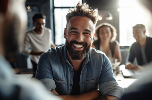 a close up shot of a sitting man at a table, laughing facing his laptop, surrounded by six happy young cool office workers dressed casually, in a bright light space , bluish tones and sunlight, undefined out of focus space, photorealistic, in the style of fujifilm pro 400h,sony fe 85mm f/1.4 gm, Unreal Engine 5, Cinematic, Color Grading, Photography, Photoshoot, Shutter Speed 1/1000, F/22, White Balance, 32k, Super-Resolution, Megapixel, ProPhoto RGB, VR, Large, Epic, Artgerm, Half Backlight, Backlight, Daylight, incredibly detailed and complex, hypermaximalistic, elegant, hyper realistic, super detailed, c 15 --s 500 --ar 80:53 --v 5.0
